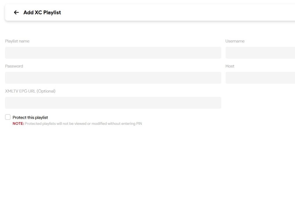 Xtream Codes: Klicken Sie auf “+Add XC Playlist”. Hier geben Sie die Server-URL, Ihren Benutzernamen und Ihr Passwort ein.