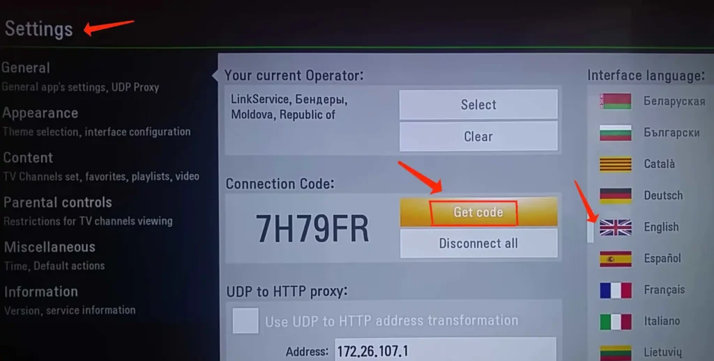 - Die Code-Methode (Empfohlen): SS IPTV nutzt ein System mit einem temporären Code. Klicken Sie auf „Get Code“. Gehen Sie nun an Ihrem PC oder Smartphone auf die offizielle Website (